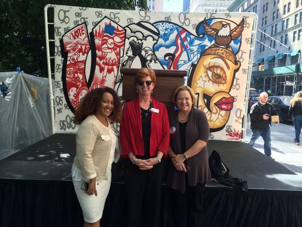 Registration is the key to participating in the elections in November that will decide who represents us on Capitol Hill and in statehouses and local offices all across the country. Yesterday, on National Voter Registration Day, in New York City and at hundreds of events around the country, League members reminded Americans that every election is important and that voter registration deadlines are rapidly approaching. In total, nearly 400 Leagues participated in 48 states! In New York, the League and its partners set up tables, provided speakers and entertainment to celebrate the unofficial holiday. The League sponsored urban artist, Lady Pink, who sprayed painted on canvas, the word “vote” using the images that remind us how important the vote is and how hard so many have had to work to get it.