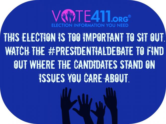 Want to attend or watch a debate in your community? Enter your address at VOTE411.org to find upcoming events and voter information in your area!