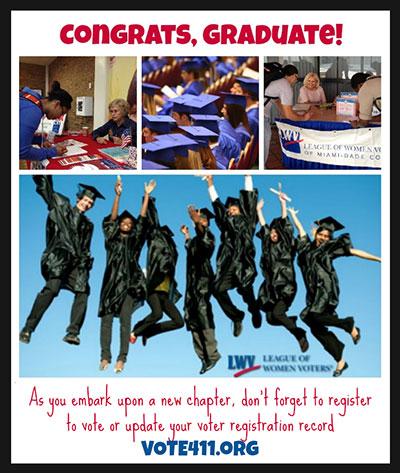 Graduation is a major milestone after which many young adults move and embark upon new challenges. The League of Women Voters wants to help these recent graduates become active and engaged members of their new communities – help us encourage the graduates in your life to register to vote.