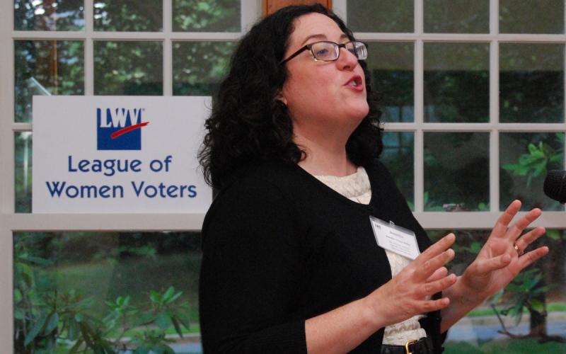The passage of the new buffer zone was greeted with relief by LWVMA—and, through a happy coincidence, many of our members were able to celebrate its passage together. On July 23, members of LWVMA were gathered at a special League event featuring Massachusetts Assistant Attorney General Jennifer Grace Miller (pictured above), who had argued McCullen on behalf of the Commonwealth before the U.S. Supreme Court. After Miller finished sharing her riveting analysis of the case and the decision with us, she glanced at her phone to check on the status of the legislation and was able to announce, amidst cheers, that the House had just passed the bill and it would be moving to the Governor’s desk for his signature.