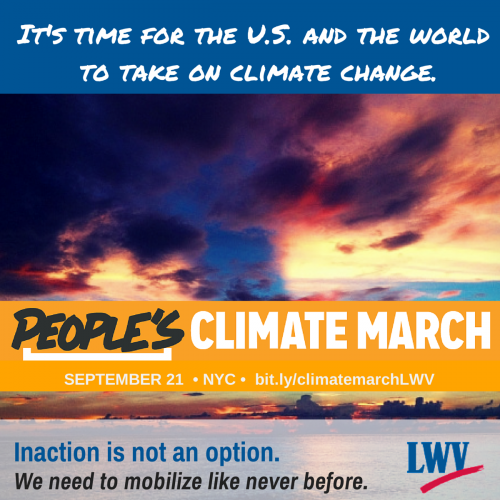 Today, League members are gathering with thousands of activists from around the world at the People's Climate March in New York City to push for strong action on climate change. The March will call attention to the strong public support for moving ahead with meaningful action to fight climate change in advance of the United Nations Climate Summit later this week. I'm excited that the League will be represented at this week's U.N. Summit to echo the support of the many League members who are attending today's March in New York City.
